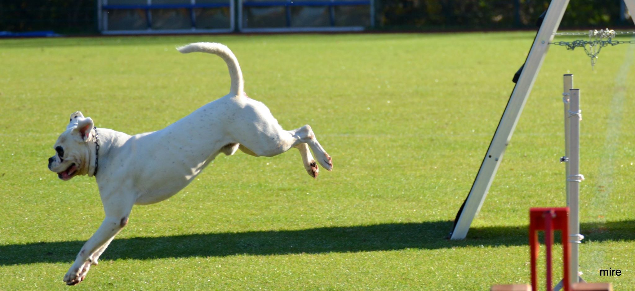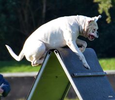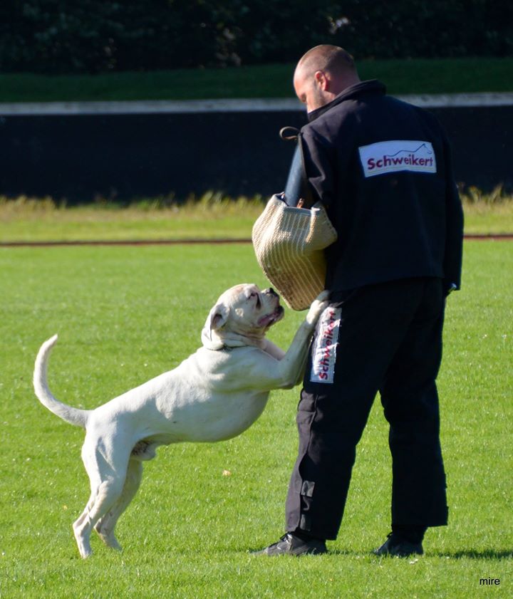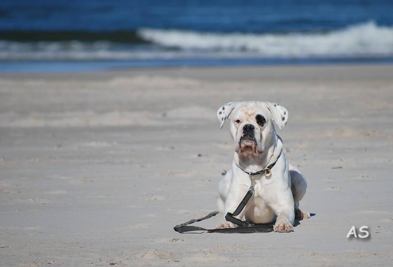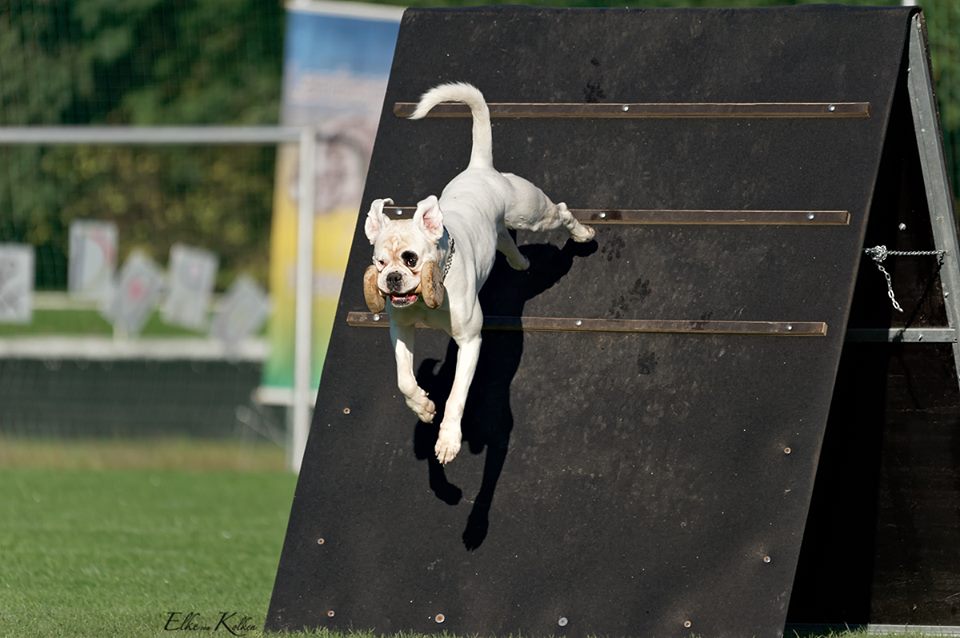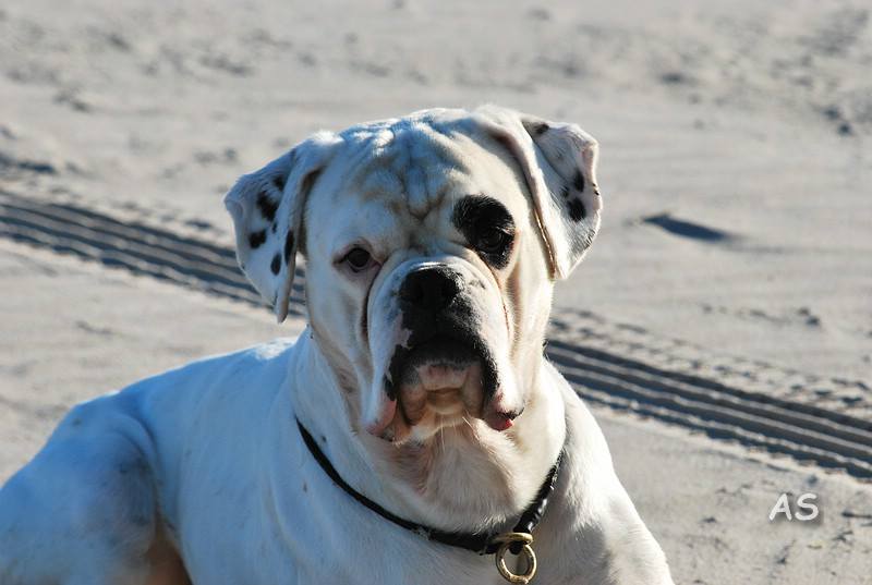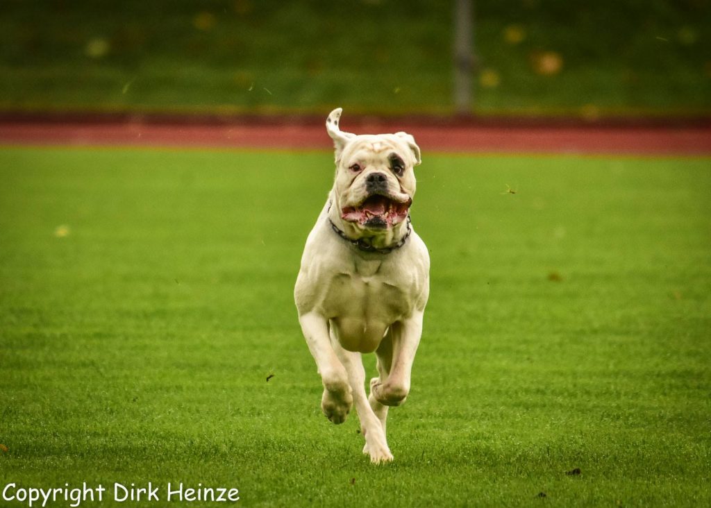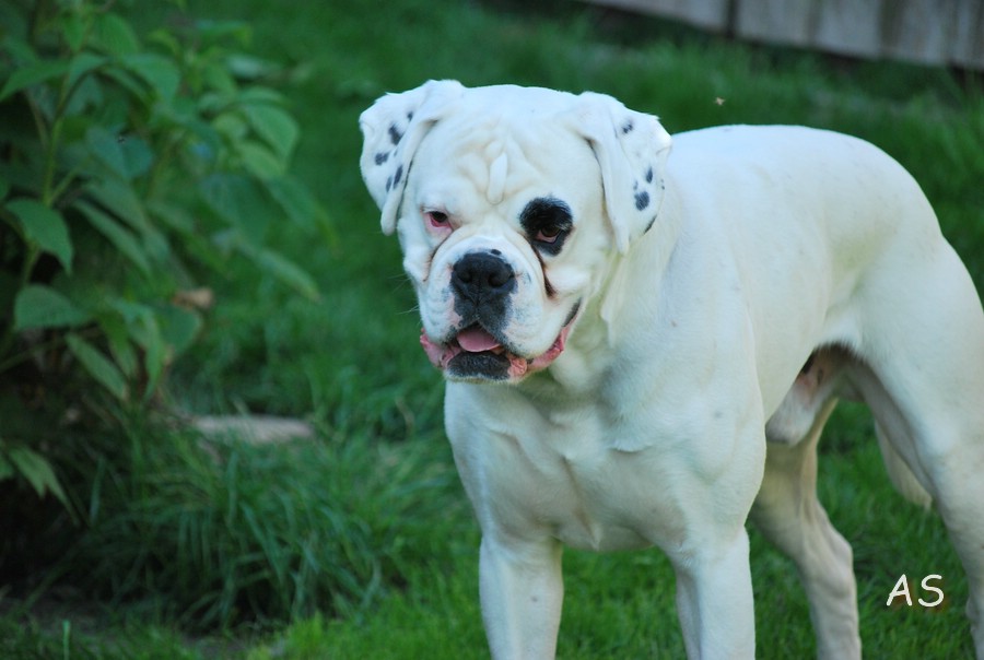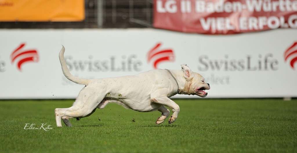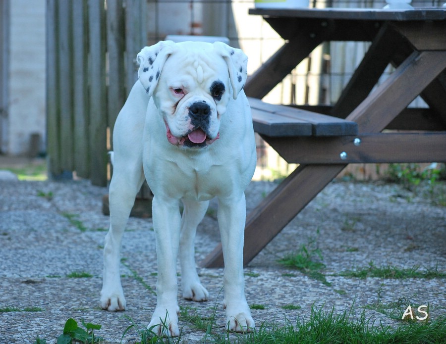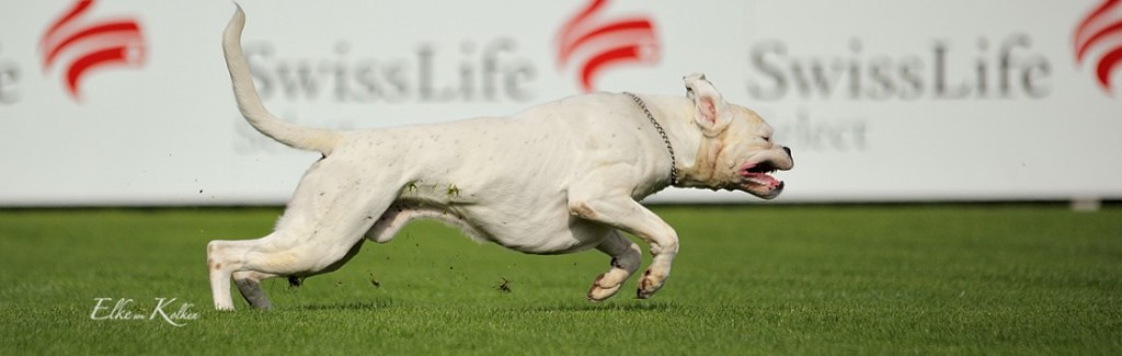 Groß, weiß mit beidseitig gepunkteten Ohren, sehr gut gewölbter Oberkopf, breiter, voller Fang, Stopp und Stulp markant, dunkle Augen, beide Nickhäute unausgefärbt, regelmäßiger Zahnstand. Quadratisches Gebäude, gut getragener Hals, sehr gut markierter Widerrist, sehr gute Brusttiefe, gleichmäßige Winkelung der Vor- und Hinterhand. Sehr verspielt in der Bewegung.